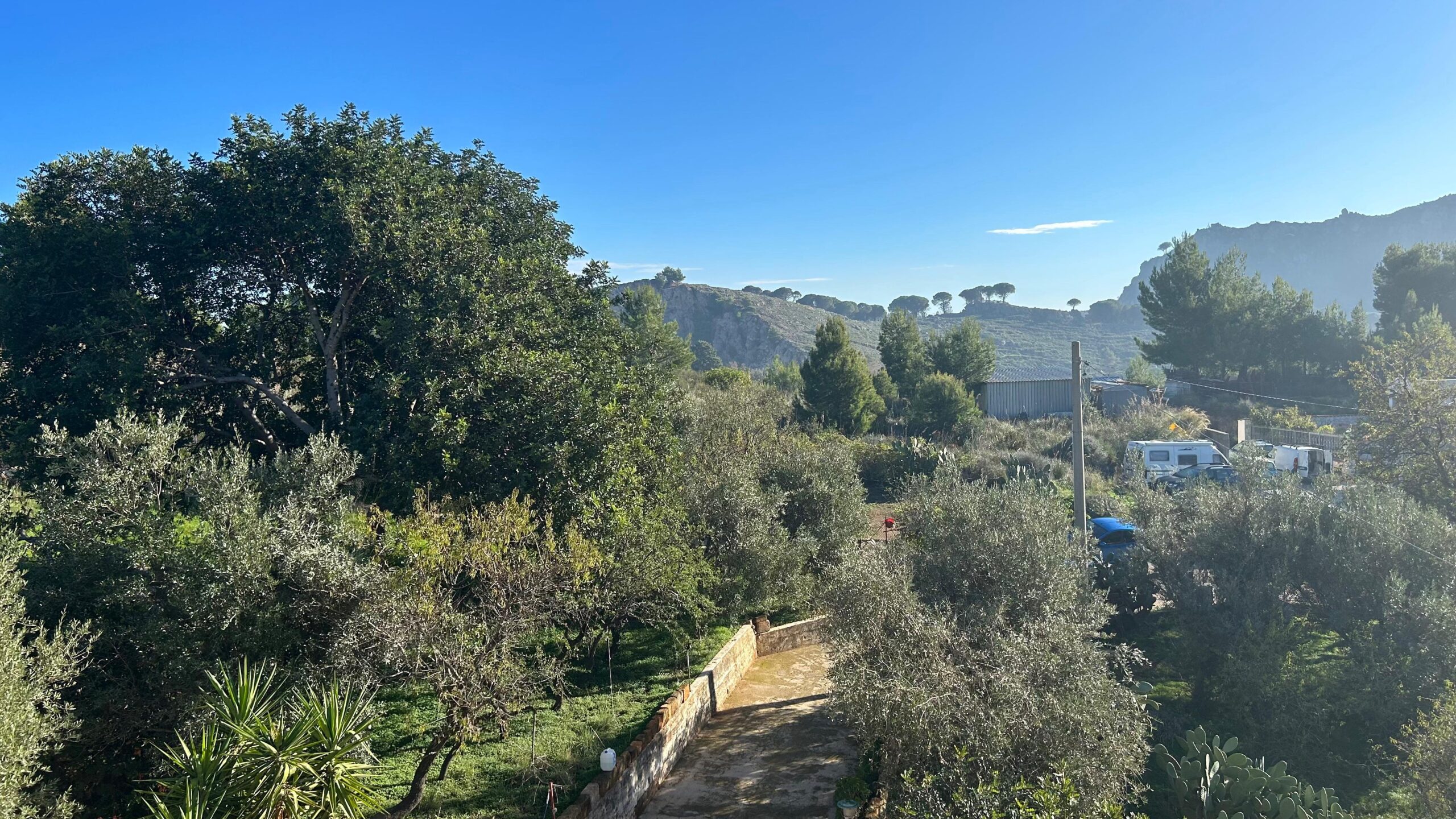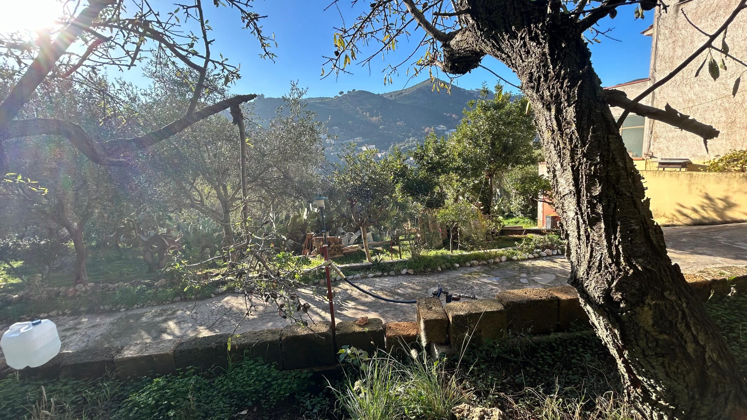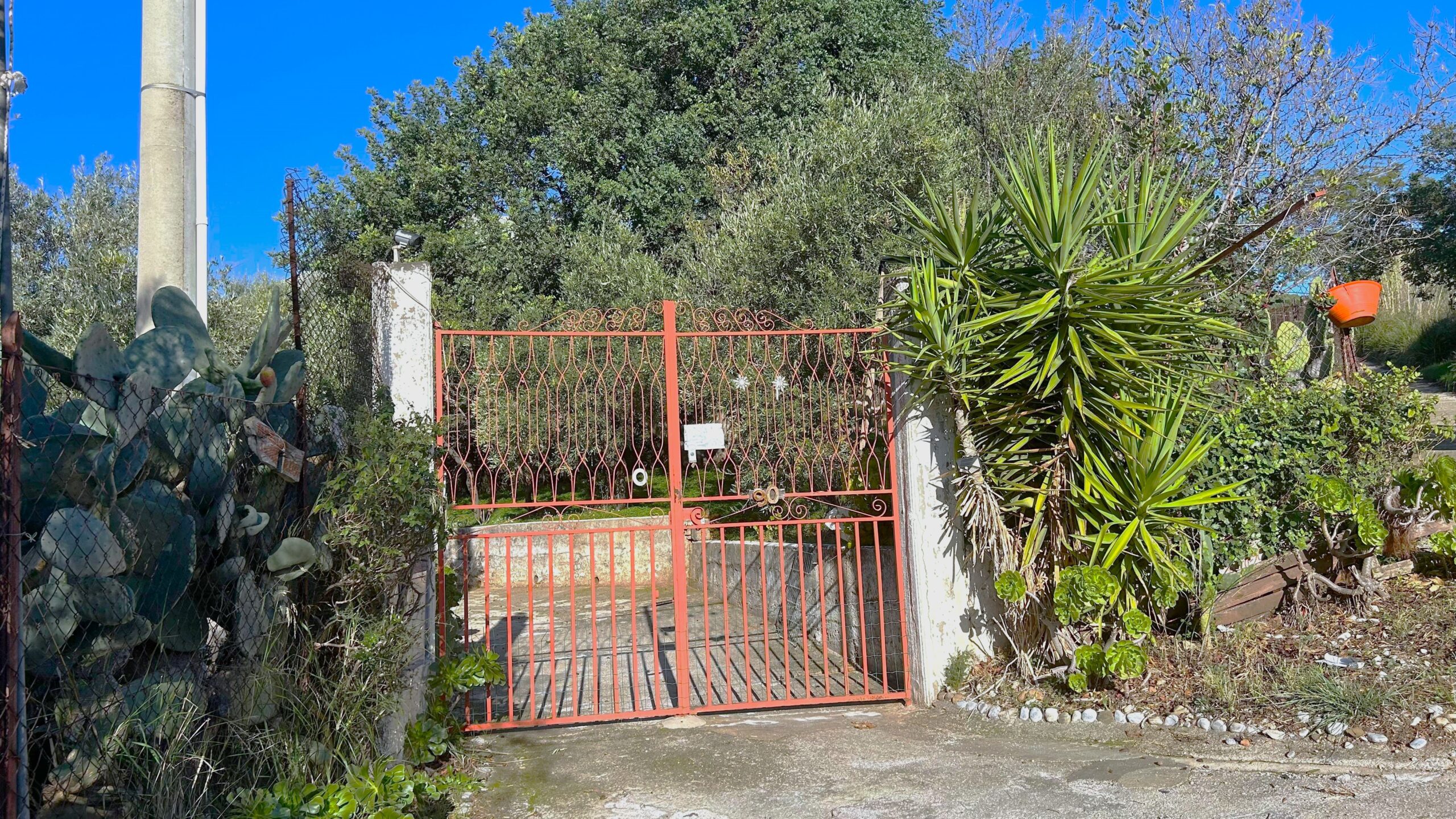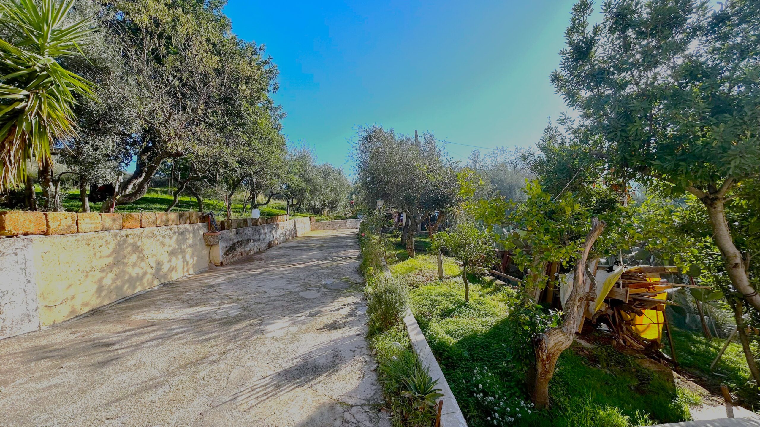 L'area esterna presenta un vasto terreno di oltre 5000m², caratterizzato dalla presenza di ulivi e una varietà di alberi da frutto.